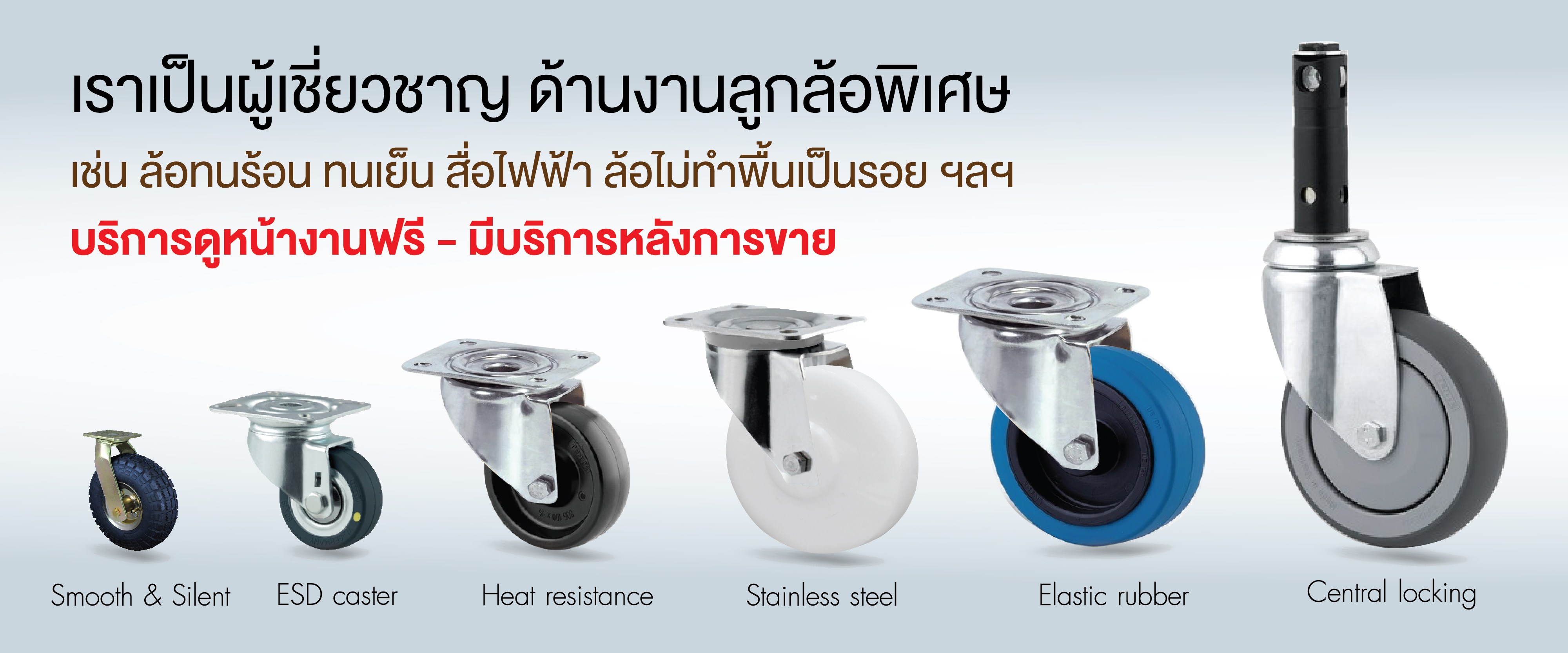ลูกล้อเป็นหัวใจของรถเข็นของ เรามีความเชี่ยวชาญเรื่องลูกล้อรถเข็นระดับแนวหน้าของประเทศ ทำให้เราสามารถนำเสนอในคุณภาพที่ดีที่สุดสำหรับลูกค้าได้ เราคำนึงถึงผู้ใช้งานเป็นหลัก ลูกล้อต้องเหมาะสมกับงาน ไม่ทำลายพื้นผิว และสร้างประสิทธิภาพงานได้ดีกว่าเดิม สินค้าของเรามีความปลอดภัยสูง เพราะเรามีการทดสอบด้วยเครื่องทดสอบมาตรฐานระดับสากล สินค้าเรามีความหลากหลายให้เลือก ทั้งจากโรงงานผลิตของเราเอง และโรงงานคู่ค้าระดับโลก สินค้าทุกชิ้นเรามีอะไหล่ให้เปลี่ยน ชิ้นส่วนไหนไม่เสียไม่ต้องทิ้ง ทำให้ประหยัดงบประมาณ เราอยู่ในธุรกิจมานานกว่า 50 ปี ทำให้เราเชี่ยวชาญและพัฒนาอย่างต่อเนื่อง
