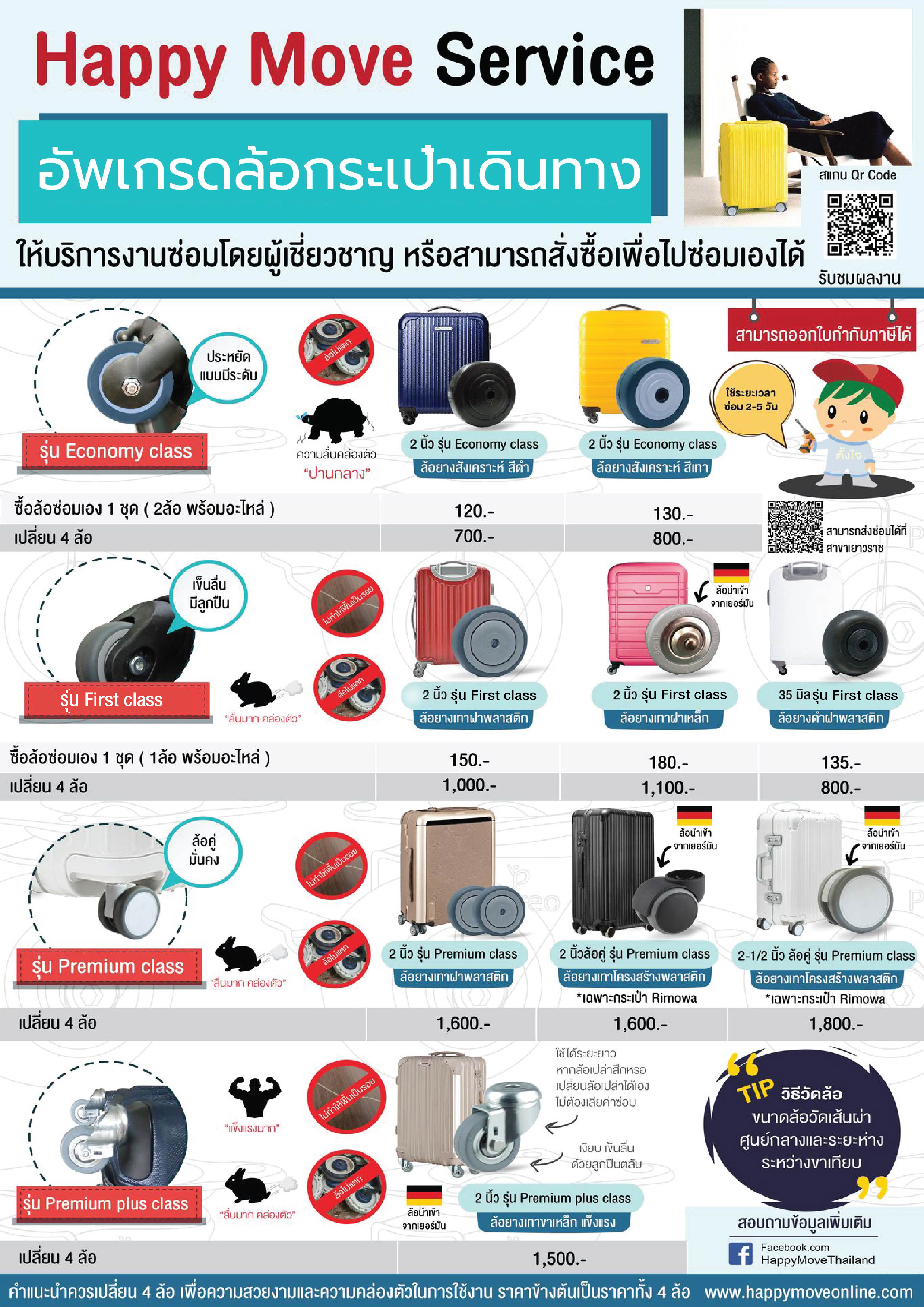 | ราคาซ่อม | ล้อเดี่ยว = ราคา 1000-1200 บาท เลือกแบบล้อได้ กระเป๋า 1 ใบ 4 ข้าง ขนาดล้อ 2 นิ้ว(50มม.) |